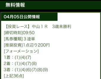 7G73387さん4月1日(水)新年度1発目にスタートダッシュを無料予想的中で届けてくれたのが