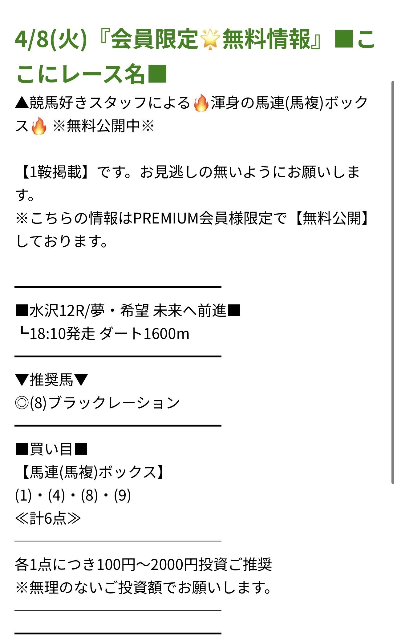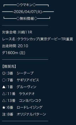 8aD3709さん8日(水)は多くの地方競馬無料予想提供サイトが