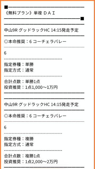 jDf6243さん無料予想買い目点数1点で単複ダブル的中