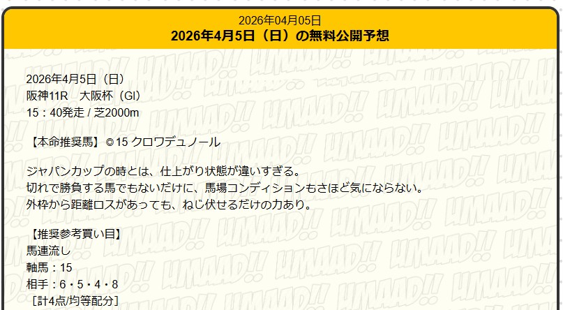 難解重賞で、しかも無料予想で、唯一そこを的中させてきたのはかなり価値が高いと思いました。