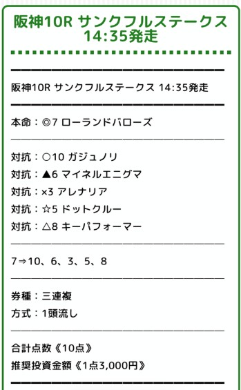 28日(日)の中央競馬最後の無料予想で阪神10R三連複的中