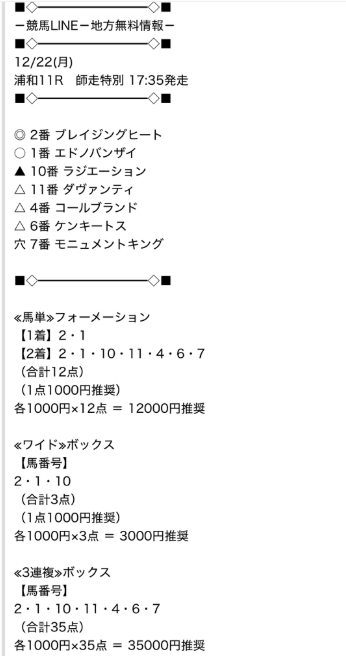 12月23日(月)の無料予想で一番の結果を届けてくれたと勝手に思っているので口コミ初めて投稿してみました!