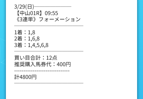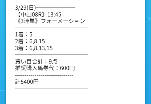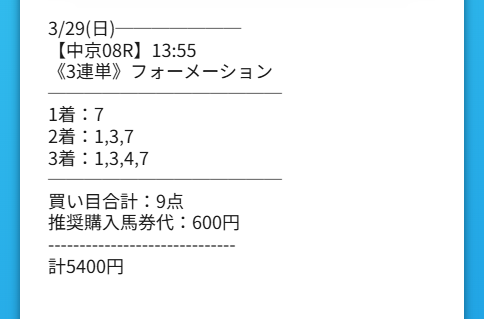 そういう生活の中でシンケイバのミリオンキーパーはかなり印象が良かったです。中山8Rで馬券代は5400円。この額なら無理はないし、何より買い目にいやらしい上手さがありました。見た目はシンプルなのに、配当を連れてくる筋だけはきっちり残していて、本命をただ並べただけの情報ではなかったです。普段から相手の本音や温度感を読む仕事をしているせいか、こういう買い目の組み方には妙に説得力を感じました。