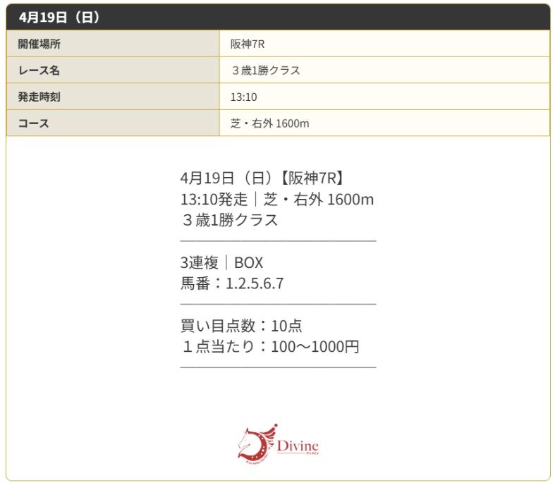 阪神7Rでディバインが出していた三連複BOX1・2・5・6・7は、まさにそこをちゃんと狙っていた感じでした。