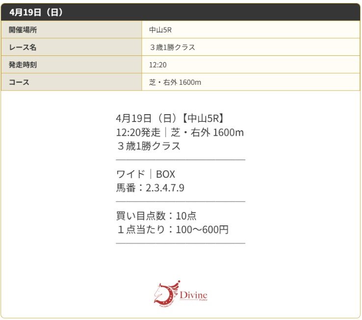 4月19日のディバインは、中山5RのワイドBOX2・3・4・7・9で的中。