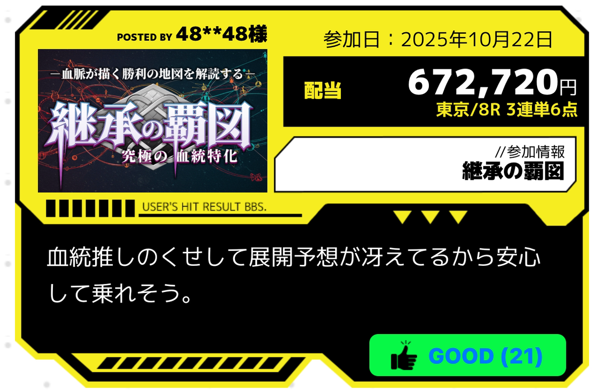 この口コミ自分のですね! なんか、こうやってサイトでピックアップされると恥ずかしい!! でも実際血統推しなのに展開予想うますぎて思わず本音を書いてしまいました!