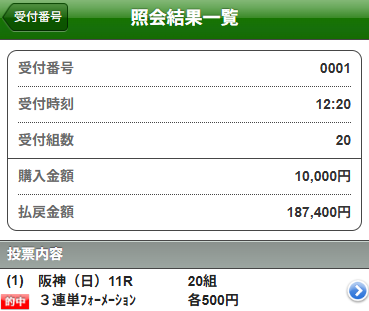 三連単3万馬券をきっちり的中させ187,400円を獲得
