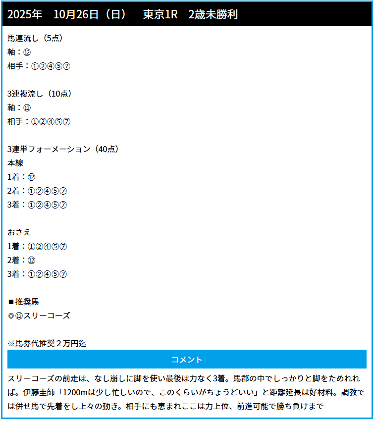 11月1日(土)JRA無料予想東京1R的中
